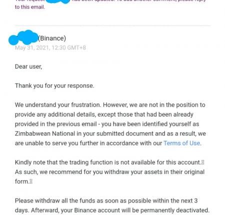 You have identified yourself as a Zimbabwean national in your submitted document and as a result, we are unable to serve you further in accordance with our terms of use. Kindly note that the trading function is not available for this account. As such, we recommend that you withdraw your assets in their original form.