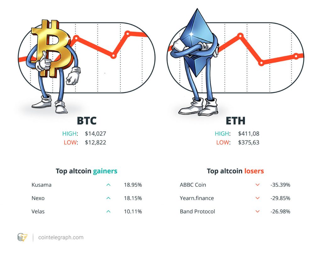 Among the biggest 100 cryptocurrencies, the top three altcoin gainers of the week are Kusama (18.95%), Nexo (18.15%)and Velas (10.11%). The top three altcoin losers of the week are ABBC Coin (-35.39%), Yearn.finance (29.85%) and Band Protocol (26.98%).