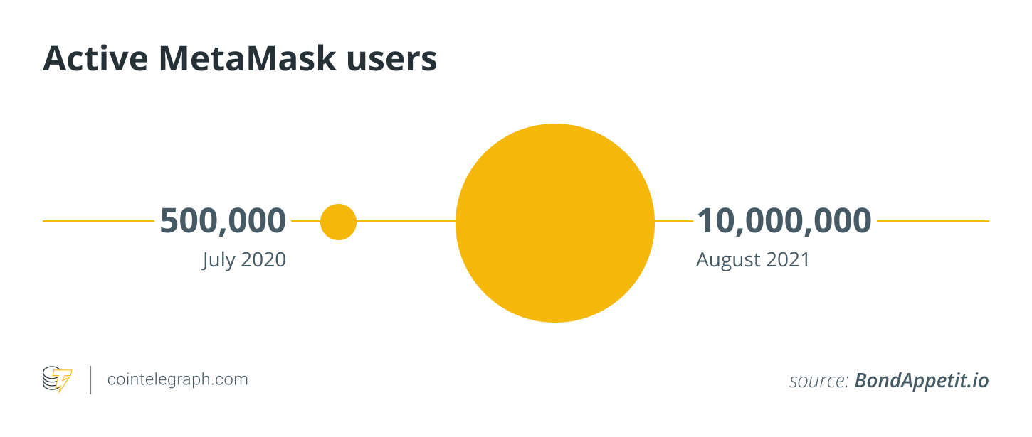 Crypto crackdown accelerates DeFi trend. Even though countries like China continue to crack down on crypto, it will only accelerate the use of DeFi. Active Ethereum wallet and browser extension MetaMask users have 10x-ed to 10 million in August 2021. While this is a seemingly high number, it represents only a 5% penetration rate amongst the 221 million global crypto users. This shows that the general crypto users, who are used to frictionless centralized services such as Robinhood, are a massive untapped market for DeFi and can be captured as the UI/UX is improved.