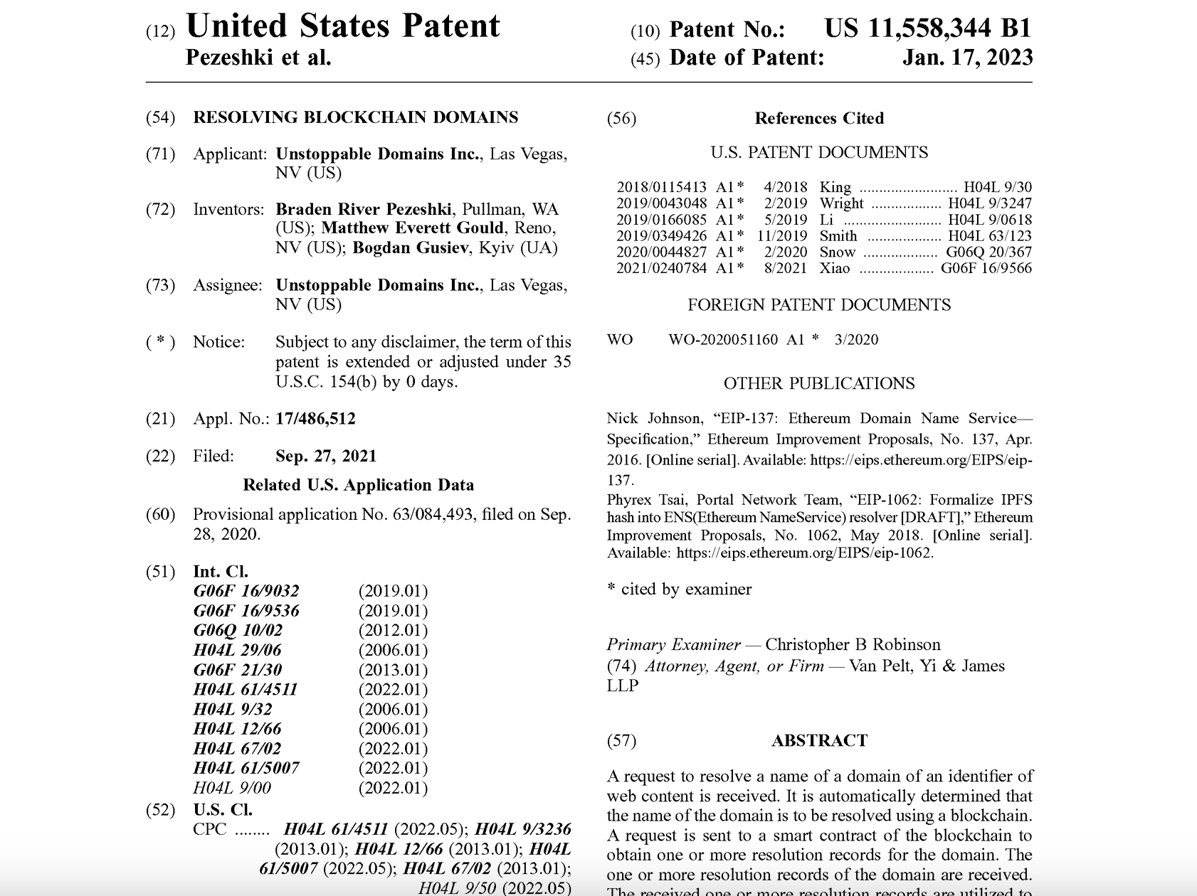 In January, Unstoppable Domains was granted its first patent, US11558344, which claims that Braden River Pezeshki, Matthew Everett Gould and Bogdan Gusiev are the inventors of a technology that uses blockchain technology to determine domains. The patent request was filed with the United States Patent and Trademark Office in 2021.