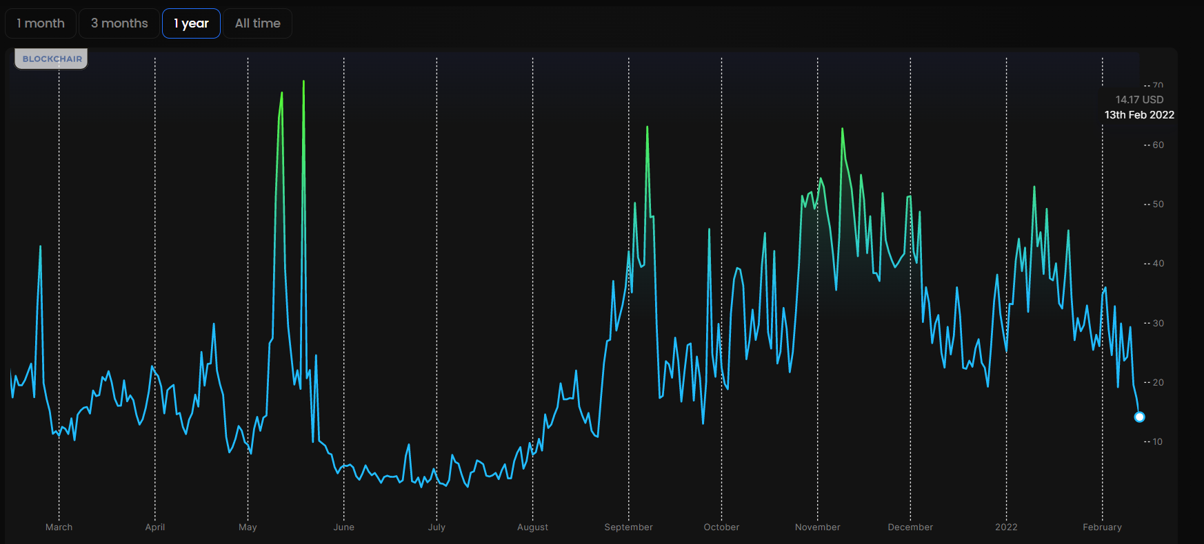 Data from Blockchair shows that the average transaction fee of ETH in January was $53.03, which at its peak was $70.83 back in May 2021. Just within a month, the average fees saw an almost 73.3% decline as evidenced by the following chart.