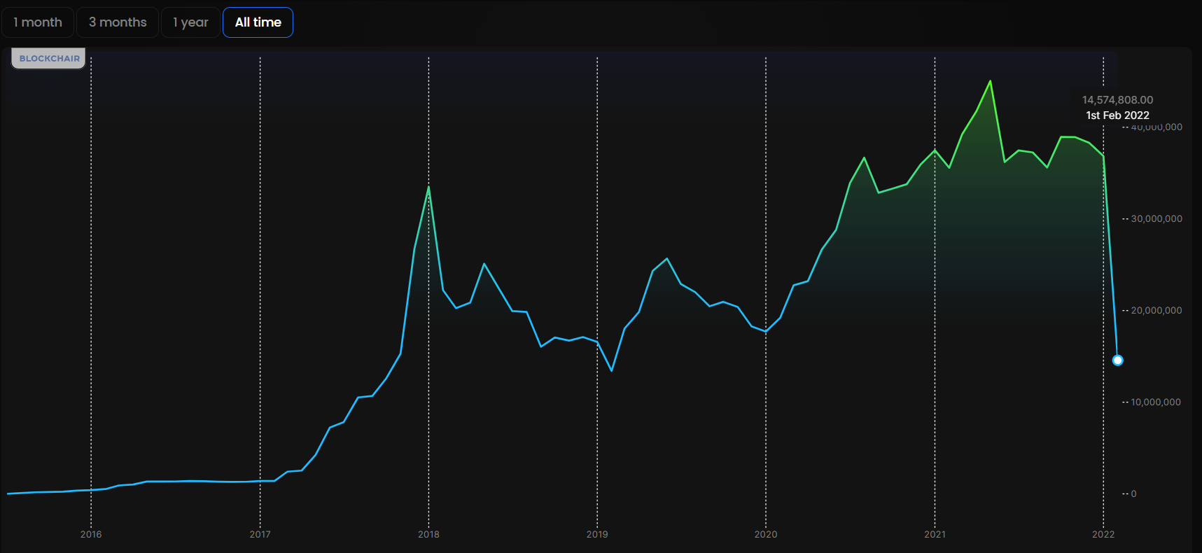 Interestingly enough, the transaction count of the Ethereum network has also come down to numbers that were last seen back in early 2019. Blockchair data show that on Feb. 1, Ethereum’s transaction count went down to 14,574,808 from 36,851,128 — a 60.44% drop in just one month.