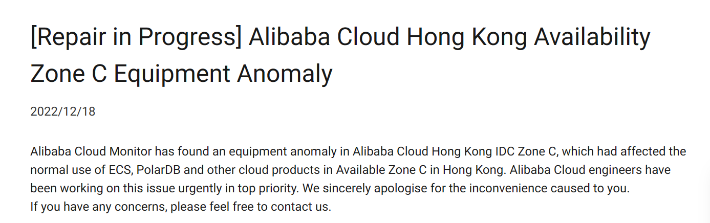 Alibaba Cloud’s website shows that the Hong Kong (China) server hosts three availability zones, which have been operational since 2014. The cloud provider confirmed the outage through an official announcement, as shown below.