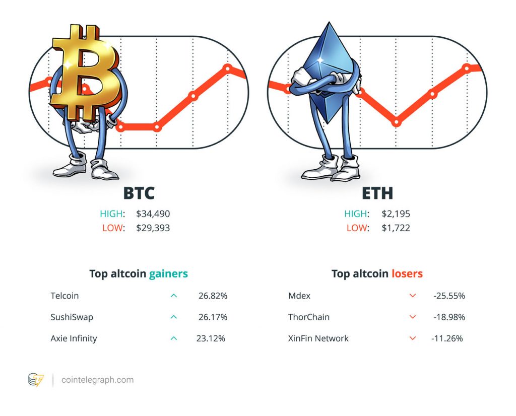Among the biggest 100 cryptocurrencies, the top three altcoin gainers of the week are Telcoin (TEL) at 26.82%, SushiSwap (SUSHI) at 26.17%, and Axie Infinity (AXS) at 23.12%.