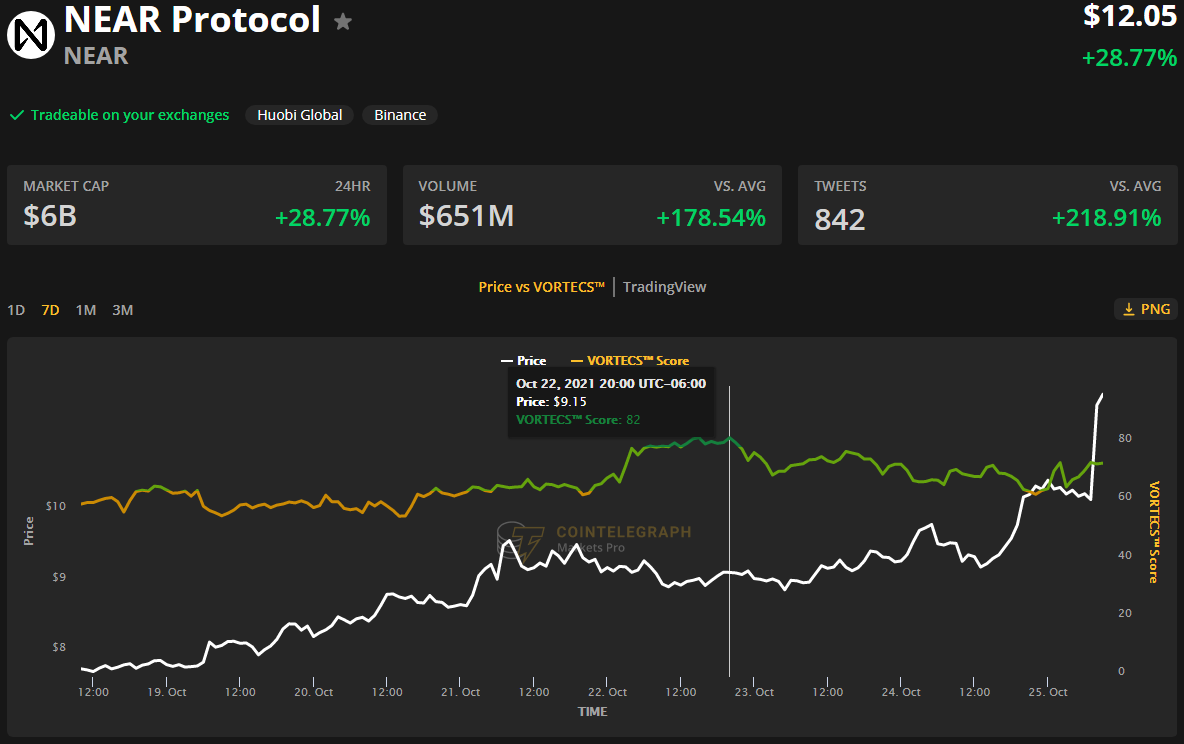 As seen in the chart above, the VORTECS™ Score for NEAR began to pick up on Oct. 22 and reached a high of 82 around 41 hours before the price increased 33% over the next day.