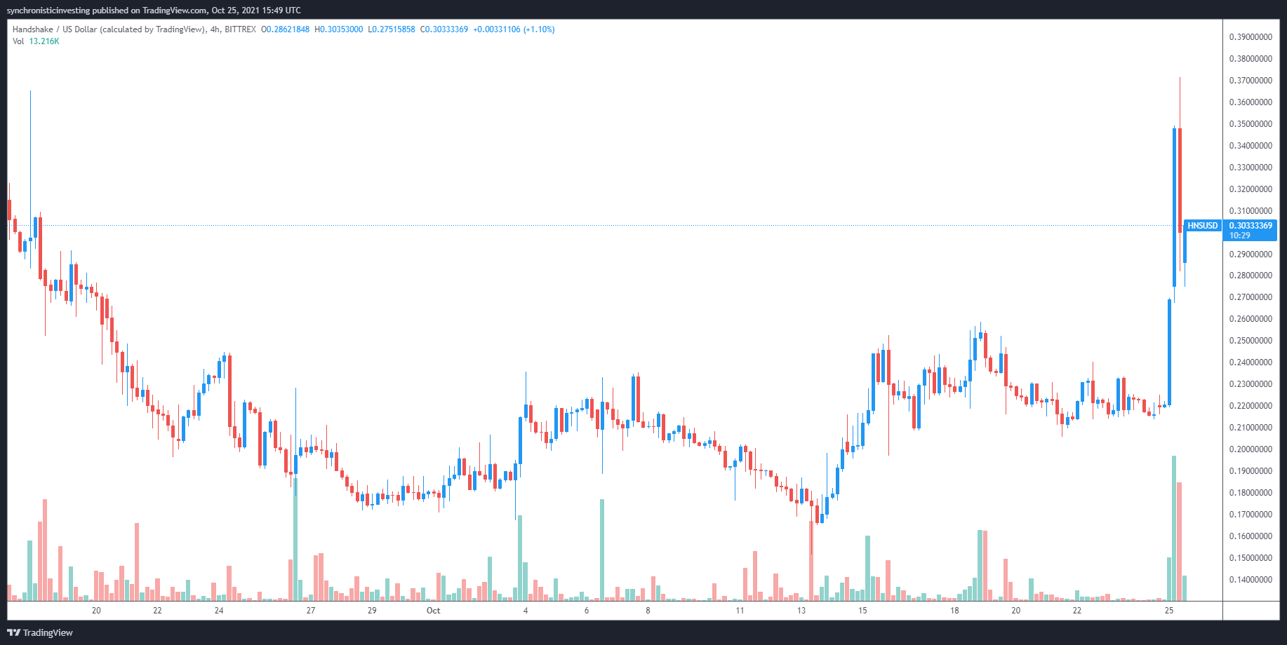 Data from Cointelegraph Markets Pro and TradingView shows that after hitting a low of $0.213 on Oct. 24, the price of HNS spiked 74% to an intraday high at $0.371 as its 24-hour trading volume surged by 491% to $3.9 million.