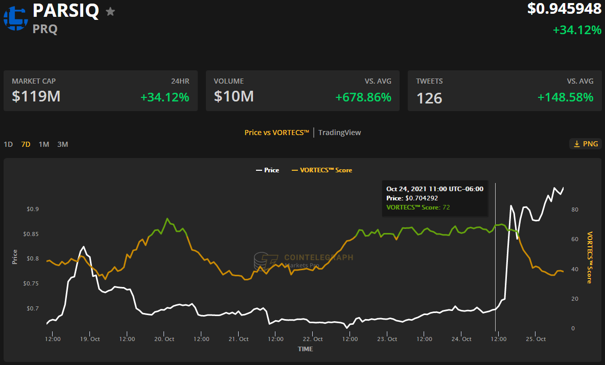 Data from Cointelegraph Markets Pro and TradingView shows that the biggest gainers over the past 24 hours were PARSIQ (PRQ), Handshake (HNS) and NEAR Protocol (NEAR).