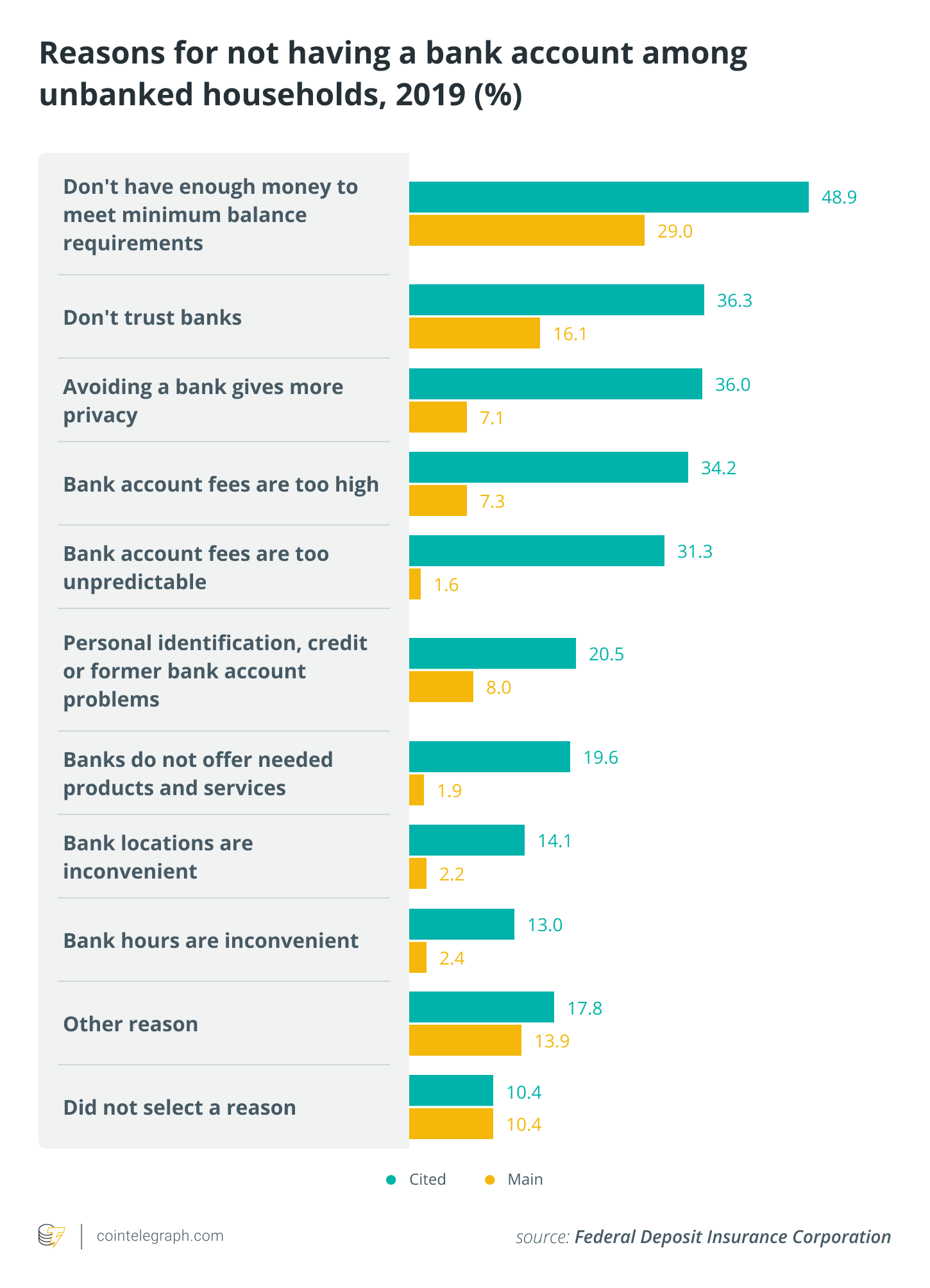 Since the financial downturn, people have begun questioning established companies and traditional systems such as banks. With more than half the world’s population aged under 30 and 55% of the world’s 7.7 billion citizens now online, seeking alternative solutions to the financial structures in place has become much more than a niche. Twelve years after the 2008 financial crisis, people still seem wary of banks. According to a household survey from the Federal Deposit Insurance Corporation, outside of high fees and minimum balances, the unbanked have pointed to a lack of trust and privacy when dealing with banks as reasons for their not owning a checking or savings account. When combined, the lack of trust (16.1%) and lack of privacy (7.1%) account for almost a quarter (23.2%) of the main reasons why unbanked people do not have an account.