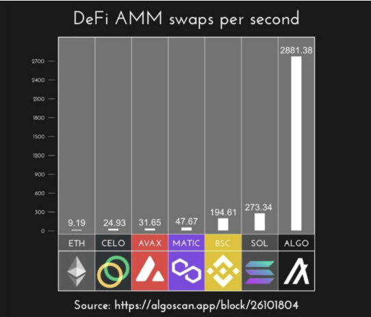 In terms of smart contract throughput, Algorand has outpaced other leading Layer 1 (L1) blockchains, such as Solana, BNB Smart Chain, Avalanche, Polygon, Celo, and Ethereum, as seen in the figure below.