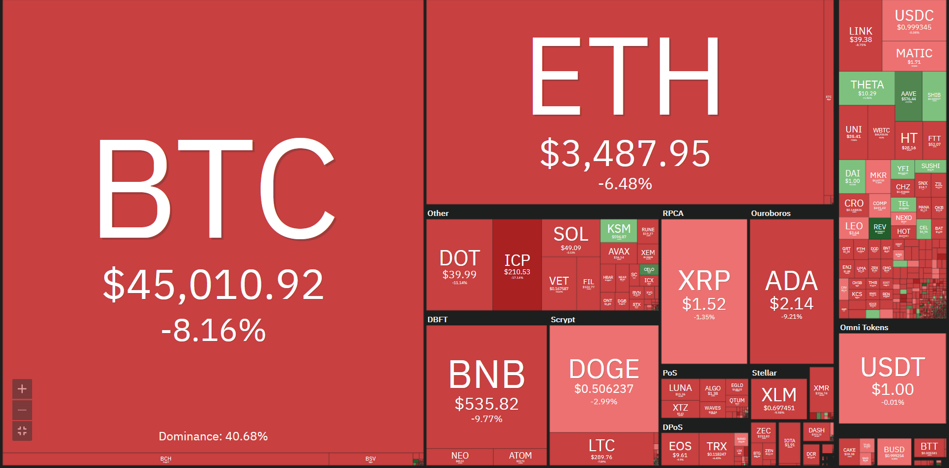 Per the exact market capitalization, Bitcoin has tanked from over $1 trillion a few weeks ago to $843,071,072,876. Ethereum market cap is almost half that of BTC and comes in at $404,613,783,369 while Binance Coin, Cardano, and Dogecoin’s capitalization have dropped to $81 billion, $69.4 billion, and $65 billion respectively.