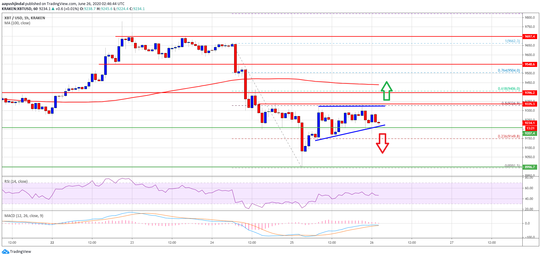 On the other hand, bitcoin price might start a fresh decline if it fails to stay above the triangle support and $9,200. An initial support below the $9,200 level is at $9,150.