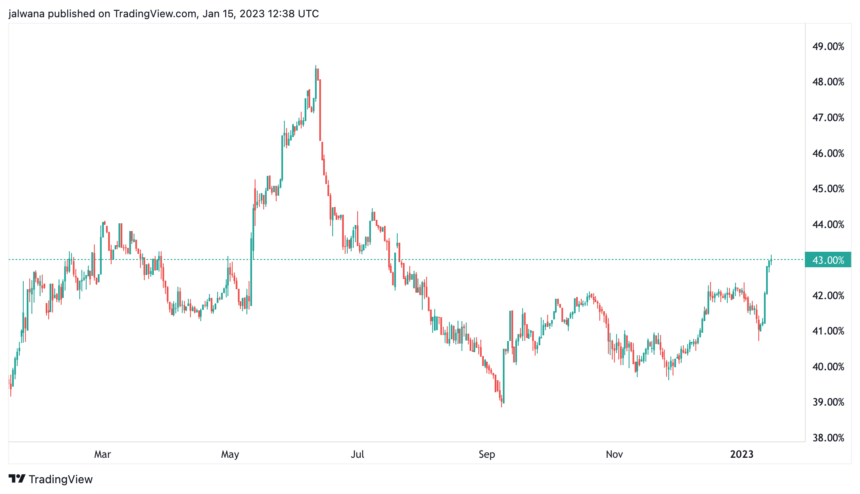 Even if the cryptocurrency industry crashed in 2022, Bitcoin’s status as the “alpha coin” has remained remarkably stable. With a market capitalization of over $398 billion and a trading volume of $24,180,295, Bitcoin’s dominance in the last 24 hours has increased by 43%.