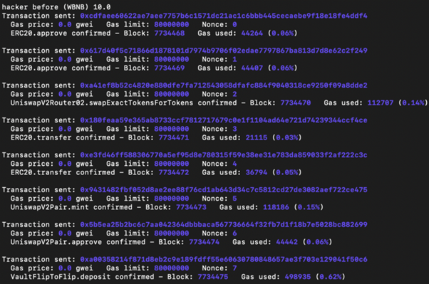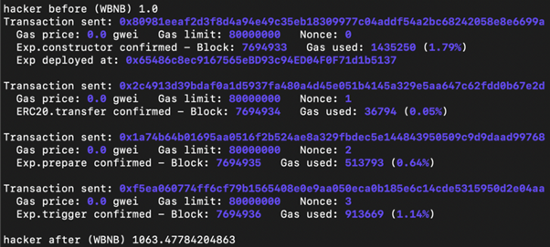 In our experiment, the bad actor starts with 1 WBNB. With the help of flash loans, he profits from more than 1,000 WBNB being returned in one transaction.