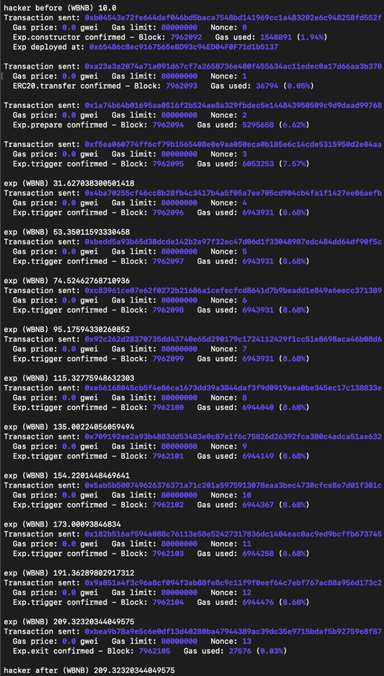 In our experiment, the bad actor starts with 10 WBNB and walks away with around 165 WBNB by repeating the four steps 10 times.