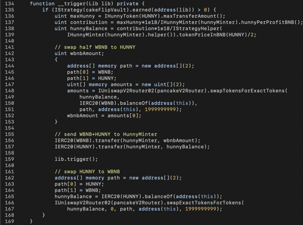 After preparing 10 Lib contracts, the main contract iterates each of them to: 1) swap WBNB to the maximum allowable amount of HUNNY; 2) transfer WBNB+HUNNY to HunnyMinter; 3) trigger getReward() via lib.trigger(); and 4) swap HUNNY back to WBNB.