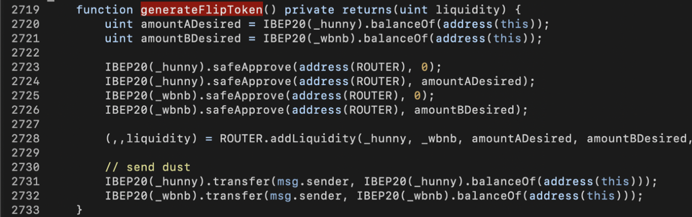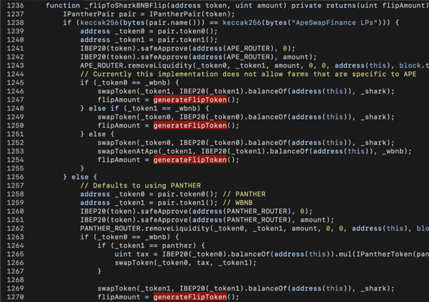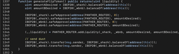 In the underlying implementation of tokenToSharkBNB() , there’s another attack surface. As shown in the above code snippet, _flipToSharkBNBFlip() removes liquidity from ApeSwap (line 1243) or PantherSwap (line 1262) and converts the LP tokens into SHARK+WBNB. Later on, the generateFlipToken() is invoked to convert SHARK+WBNB into SHARK-BNB LP tokens.