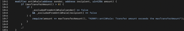 The theory behind the PancakeHunny attack is similar to the AutoShark attack. In brief, we need to send a lot of HUNNY+WBNB to HunnyMinter before triggering getReward(). However, the HUNNY token contract has a protection mechanism called antiWhale to prevent large amount transfers. Therefore, flash loans do not work here.