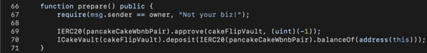 Inside Lib.prepare(), we approve() the CakeFlipVault to spend the LP tokens and invoke CakeFlipVault.deposit() to enable the later getReward() calls for minting rewarding HUNNY tokens.