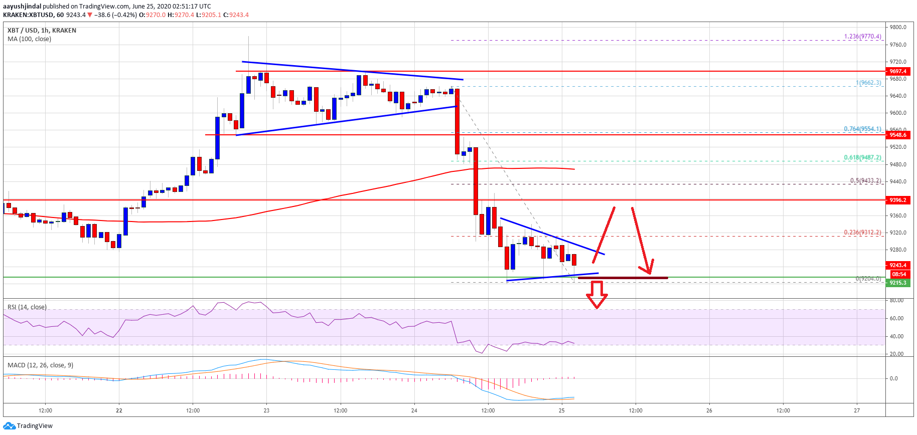 - The price is trading near the $9,200 support and well below the 100 hourly simple moving average.