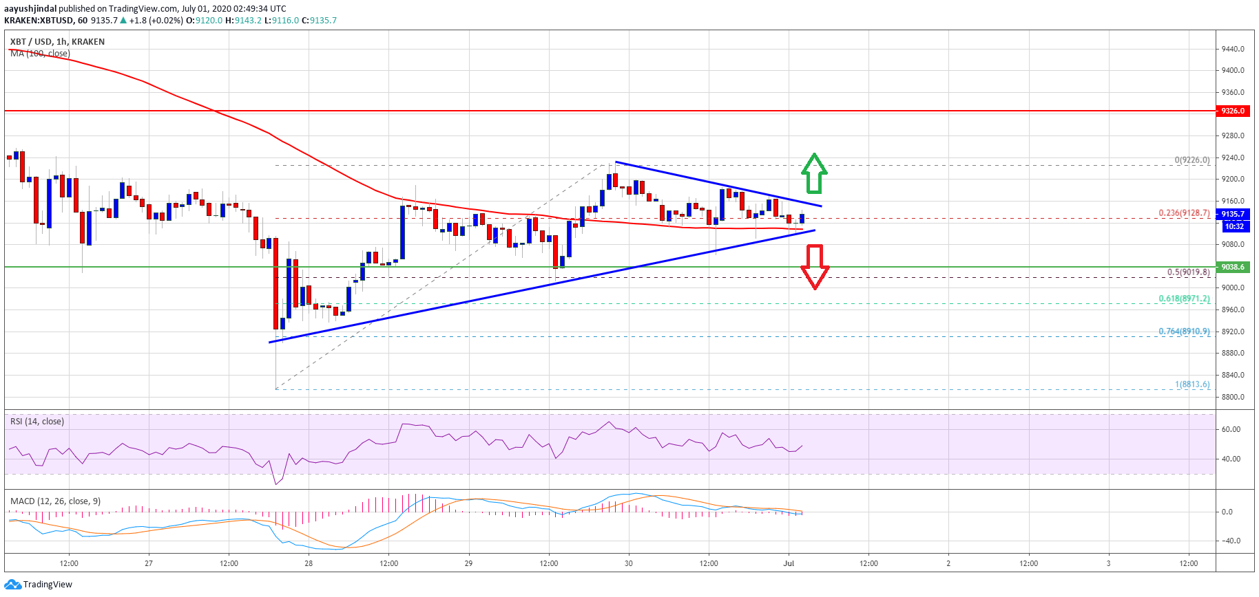 If there is an upside break above the triangle resistance, the price could start a decent increase. An immediate resistance could be the $9,225 swing high. The main resistance is still near $9,300.