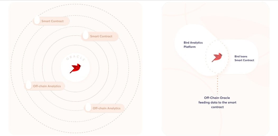 Bird.Money’s blockchain Oracle is developing the tools and mechanisms required to advance DeFi to the next stage in its evolutionary progression as the newest, trustless financial system. By creating an Off-Chain Oracle Data analytics platform for the Ethereum blockchain, the Bird Oracle connects external services and investors to the decentralised loans and finance market with low risk and guarantees. Bird analytics are used to aggregate and validate off-chain metrics in order to bring forth consensual data from multiple data points. Borrowers are then able to leverage “good” behaviour while traversing their interactions with DeFi protocols — loans paid back on time, not being overleveraged, not engaging in scams or “rug pulls” where liquidity is quickly removed from decentralized exchanges, causing a crash in token price and overall being fiscally prudent with their digital assets. That good behaviour could then be used to borrow more assets for less upfront collateral, effectively reducing your collateralized debt position (CDP).