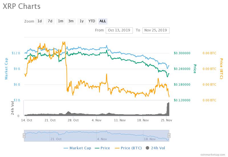 Despite the fact that XRP appears to be being used more for cross border settlement, the price of the crypto asset has not fared especially well versus the rest of the market in recent weeks and months. Despite its apparent usage by MoneyGram, the value has remained fairly constant in terms of Bitcoin and has dropped in tandem with other digital assets lately in terms of dollar value.