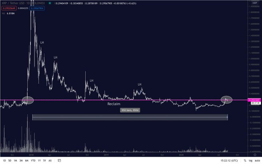 “You despise money if you don’t own XRP. Maximum point of financial opportunity is right at these levels. Reclaimed the area where the 17′ bull run had kicked off after a deviation below a year long support range. A massive bull flag. Think Mid term (2-3 months) .93c.”