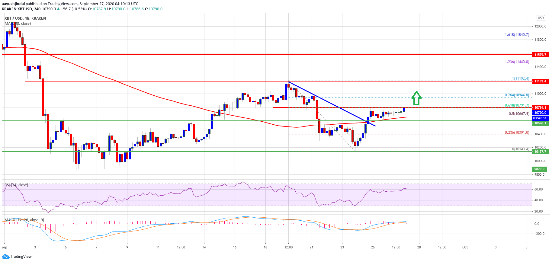 Bitcoin climbed above the 50% Fib retracement level of the downward move from the $11,192 high to $10,140 swing low. It has opened the doors for more gains above the $10,700 level.