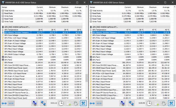 Just download and run the latest HWiNFO, you can even use the portable version, go to Monitoring and start Sensor status and then scroll down to the GPU data and see what you get reported as GPU Memory Junction Temperature data (right under the GPU Temperature). On the left image you can see the idle video memory temp we see on an ASUS EKWB GeForce RTX 3090 GPU and on the right the temperature of the video memory after we run PhoenixMiner with the tweaked RTX 3090 in order to give us 120 MHS hashrate for Ethereum mining. We get 36 degrees idle temperature, but when mining it bumps up to 92 degrees Celsius and this is a water-cooled GPU with the GPU temp going just about to 50 C under load.