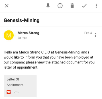 - Our job listings are hosted on genesis-group.com or via some official head hunter agencies. But just to make sure, always ask us if it is real via contact@genesis-mining.com
