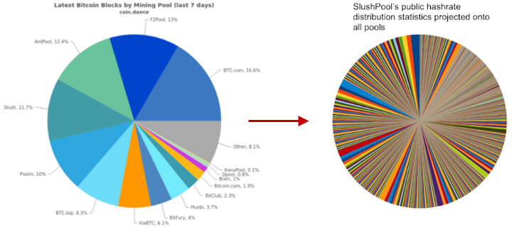 Mining pool hashpower distribution, versus Slush Pool’s miner distribution projected onto every pool.