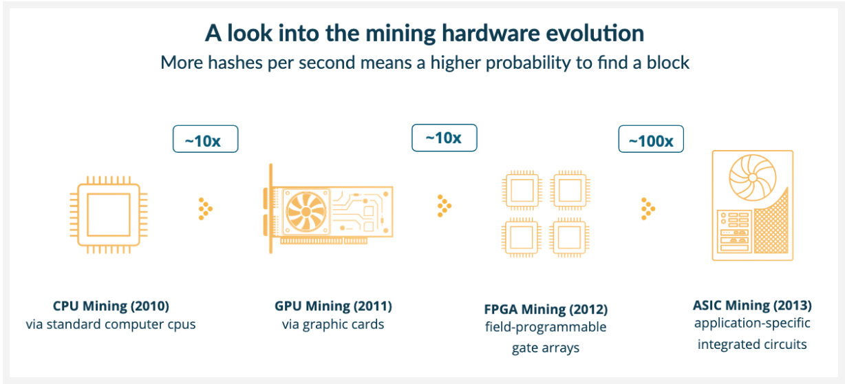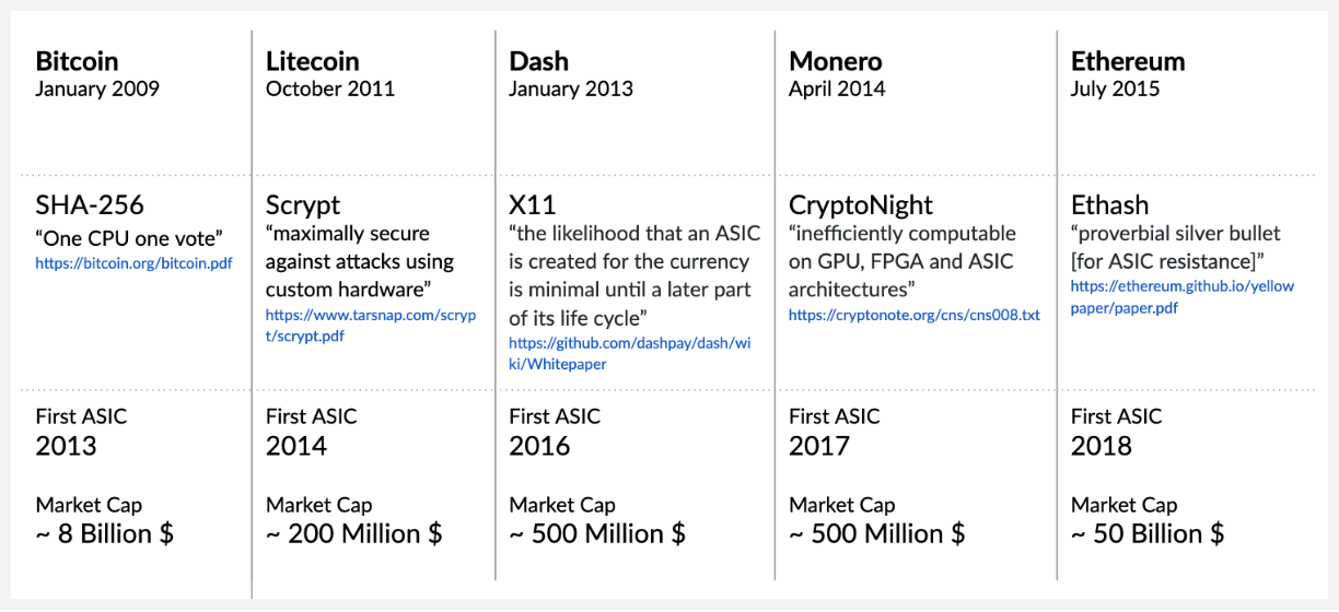 Over the years, proof-of-work based cryptocurrencies saw a myriad of employed hashing algorithms and a similar amount of hardware developments trying to crack them in the most efficient way.
