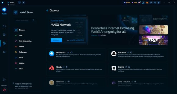 Here is how the Web3 Store with the Dapps looks like, some you probably are familiar with, others you might need to look up. They are categorized and you might want to look around, not that much are available for the moment, but the number should increase in the future. In general things are looking good and work quite well in the current MASQ Public Beta in our own opinion, though there are still some hiccups and things that might be polished a bit. Still, you can already get a good glimpse into how the final version will work and it does look promising as yet another privacy layer that will be available to you keeping you safer online with the added benefit of getting rewarded MASQ crypto tokens for sharing your bandwidth with other users of the network.