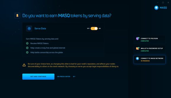 Now, the functionality to “Serve Data” using the MASQ browser is what allows you to earn MASQ tokens in return for helping other users be anonymous. This is you becoming a node in the mesh network of users that passes the encrypted user data around, so that the important privacy functionality can be achieved and you are incentivised to do it by getting MASQ tokens in return (test tokens in the Beta). You can decide not to Serve Data and you should still be able to use the MASQ browser, though you will not be earning the tokens this way and you can apparently decide to change your opinion later on and switch on/off. What caught our eye here in that setup page was that “By choosing to serve you accept legal responsibility of doing so”! This is important to note as serving other users data, even though encrypted and not in your control, you should still be somewhat legally responsible for that should someone utilize MASQ for illegal purposes.