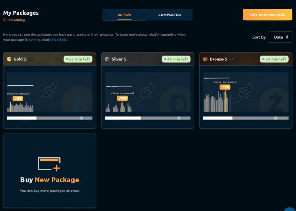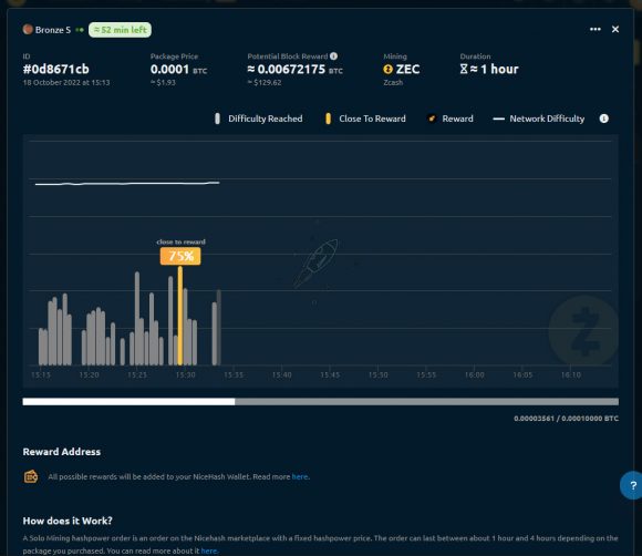The closest we got a reward with our 9 S-sized mining packages was 89% on a Bronze S package for mining ZCash (ZEC) and that one had 1:118 chance according to the data when purchasing the package, so pretty good, although a little disappointed that we were not lucky enough to hit a block and get a reward. Maybe will give it a couple more tries and you are welcome to try your own luck with a few mining packages and see if you can manage to score a block reward or not.